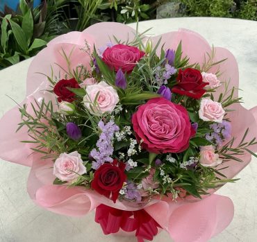 愛媛県産バラ「プライムチャーム」、愛媛県産spバラ「ストロベリーワルツ」「ファンファール」、リンドウ、スターチス、ティーツリーほか