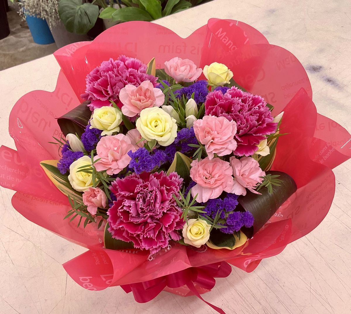カーネーション、愛媛県産spバラ「ウェディングインバイト」、spカーネーション、リンドウ、スターチス、ナルコラン、ドラセナ、ティーツリーほか