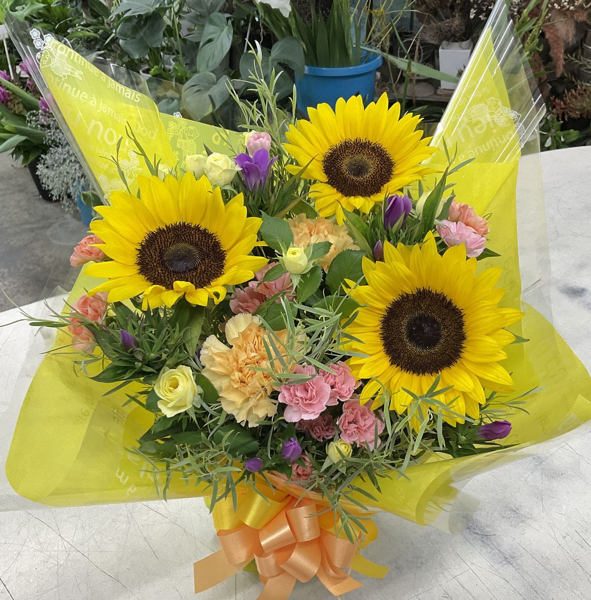 ヒマワリ、愛媛県産spバラ「ウェディングインバイト」、カーネーション、リンドウ、spカーネーション、ティーツリーほか