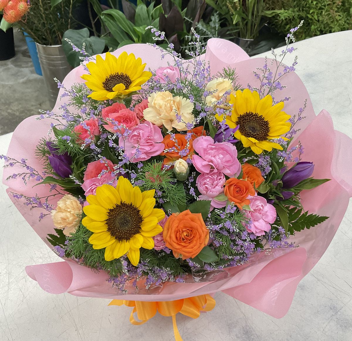 ヒマワリ、愛媛県産spバラ「ベイブ」「ローラ」、リンドウ、spカーネーション、宿根スターチス「ラプソディーブルー」、ミリオほか