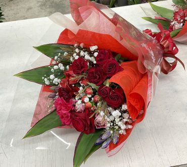 愛媛県産バラ、アルストロメリア、ヒペリカム、カーネーション、リンドウ、カスミ草、コーディライン「レモンレッドエッジ」ほか