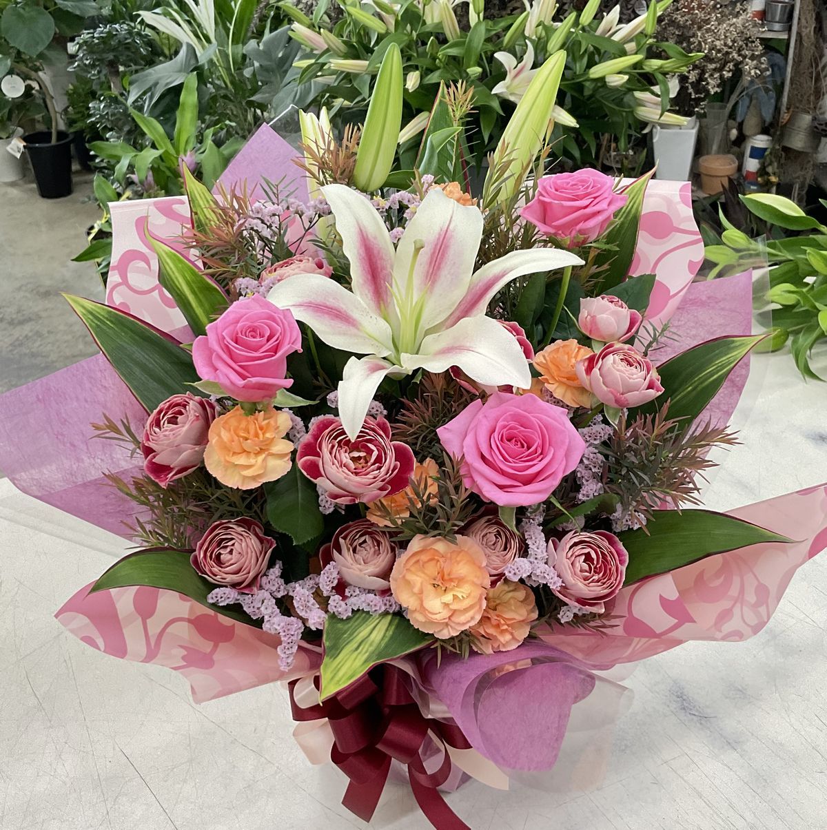 オリエンタル系ユリ「ニンフ」、愛媛県産バラ、spカーネーション、宿根スターチス、コーディライン「レモンレッドエッジ」、メラレウカほか