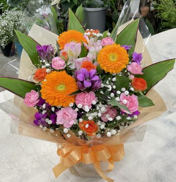 ガーベラ、愛媛県産spバラ、アルストロメリア、リンドウ、spカーネーション、かすみ草ほか