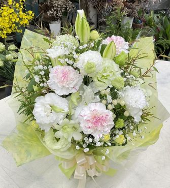 八重咲ユリ、トルコギキョウ、カーネーション、愛媛県産spバラ「ウェディングインバイト」、デンファレ、ヒペリカム、カスミソウほか