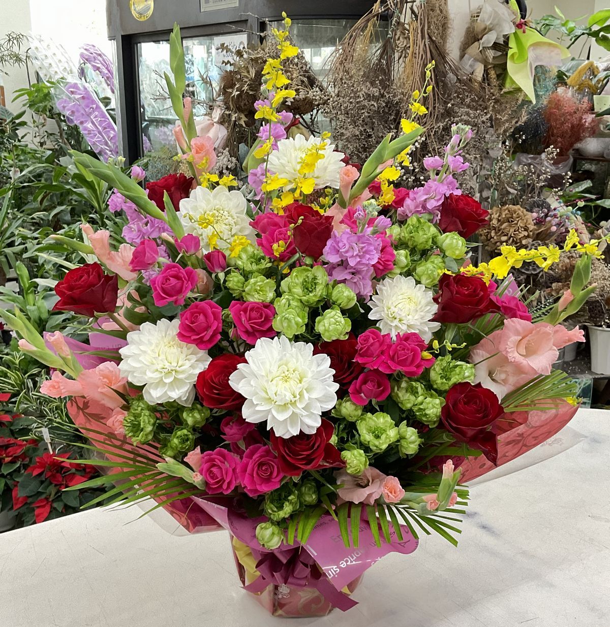 ダリア、愛媛県産バラ「ブリランテ」愛媛県産spバラ「アリシア」「オリエンタルエクレール」、ストック、グラジオラス、オンシジウムほか