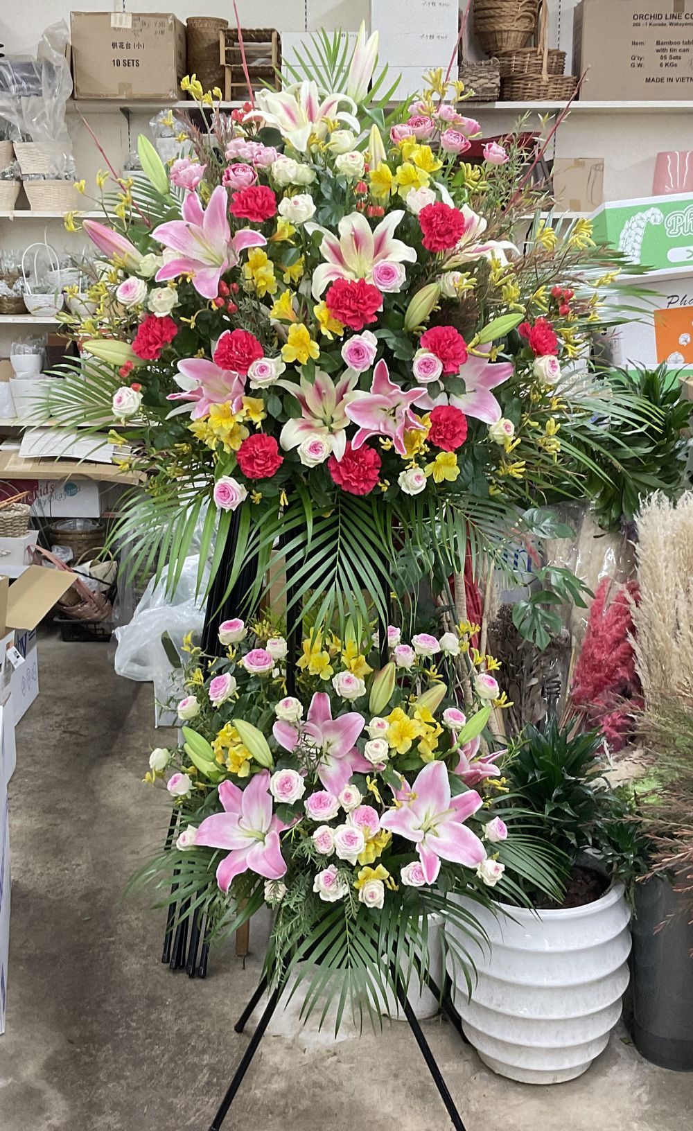 オリエンタル系ユリ、愛媛県産spバラ「ジェラート」、アルストロメリア、カーネーション、ヒペリカム、サンゴ水木、アレカヤシ、メラレウカほか