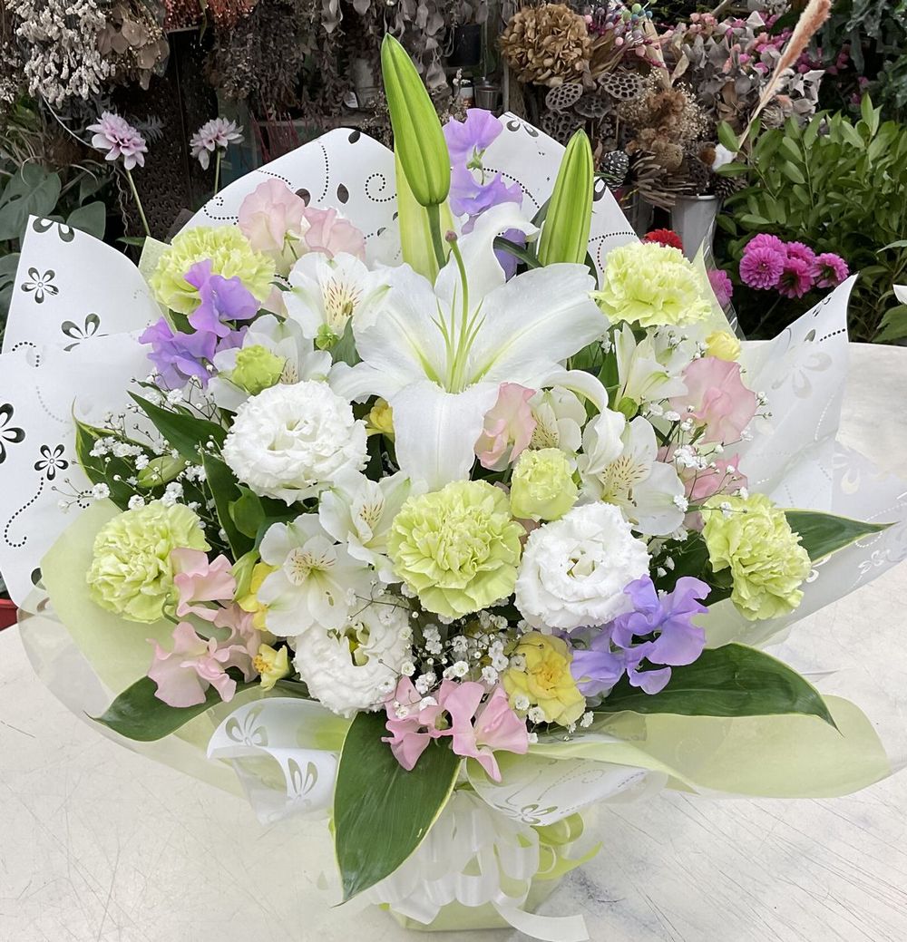 オリエンタル系ユリ、トルコギキョウ、カーネーション、アルストロメリア、スイートピー、かすみ草、ドラセナほか
