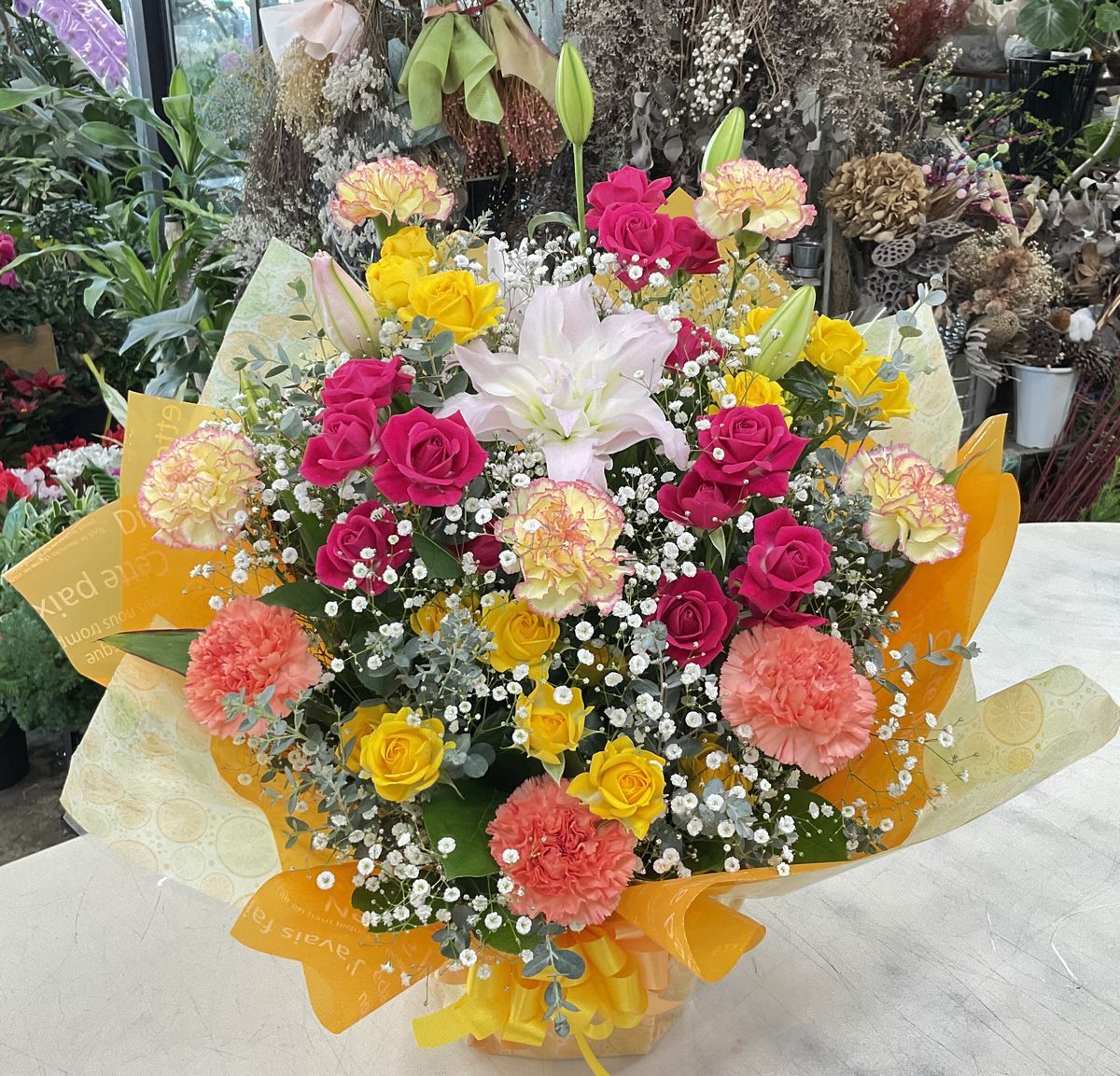 八重咲ユリ、カーネーション、愛媛県産spバラ「アリシア」「ゴールドダスト」、かすみ草、ユーカリほか