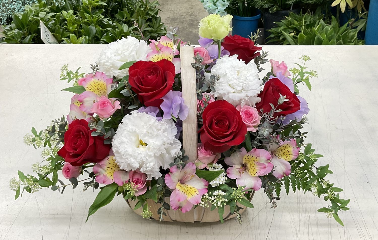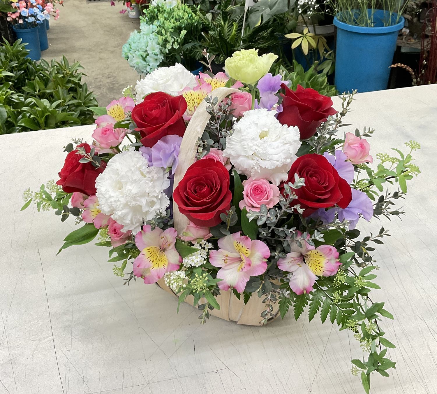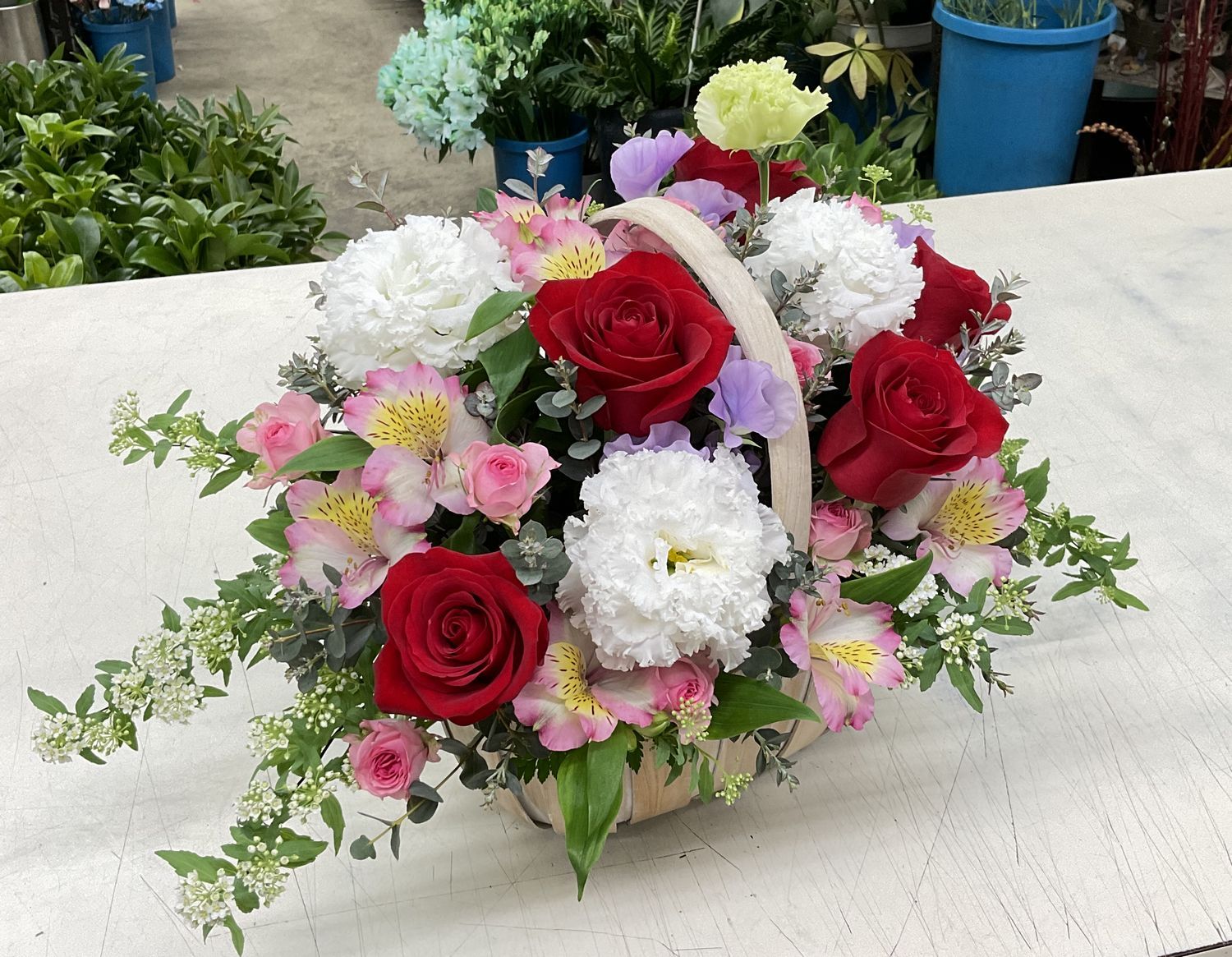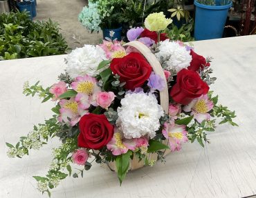 タグ: お祝い, アルストロメリア, アレンジメント, コデマリ, スイートピー, トルコギキョウ, バラ, バレンタイン, フラワーバレンタイン, ユーカリ