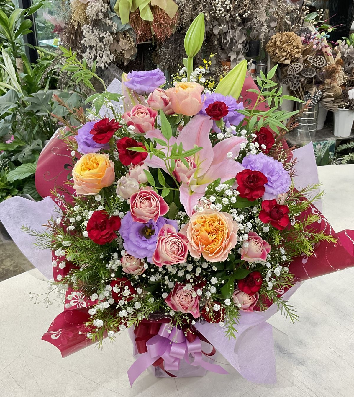 オリエンタル系ユリ、愛媛県産バラ「セントピーターズパーク」「チアフル」、トルコギキョウ、spカーネーション、かすみ草、ソケイほか