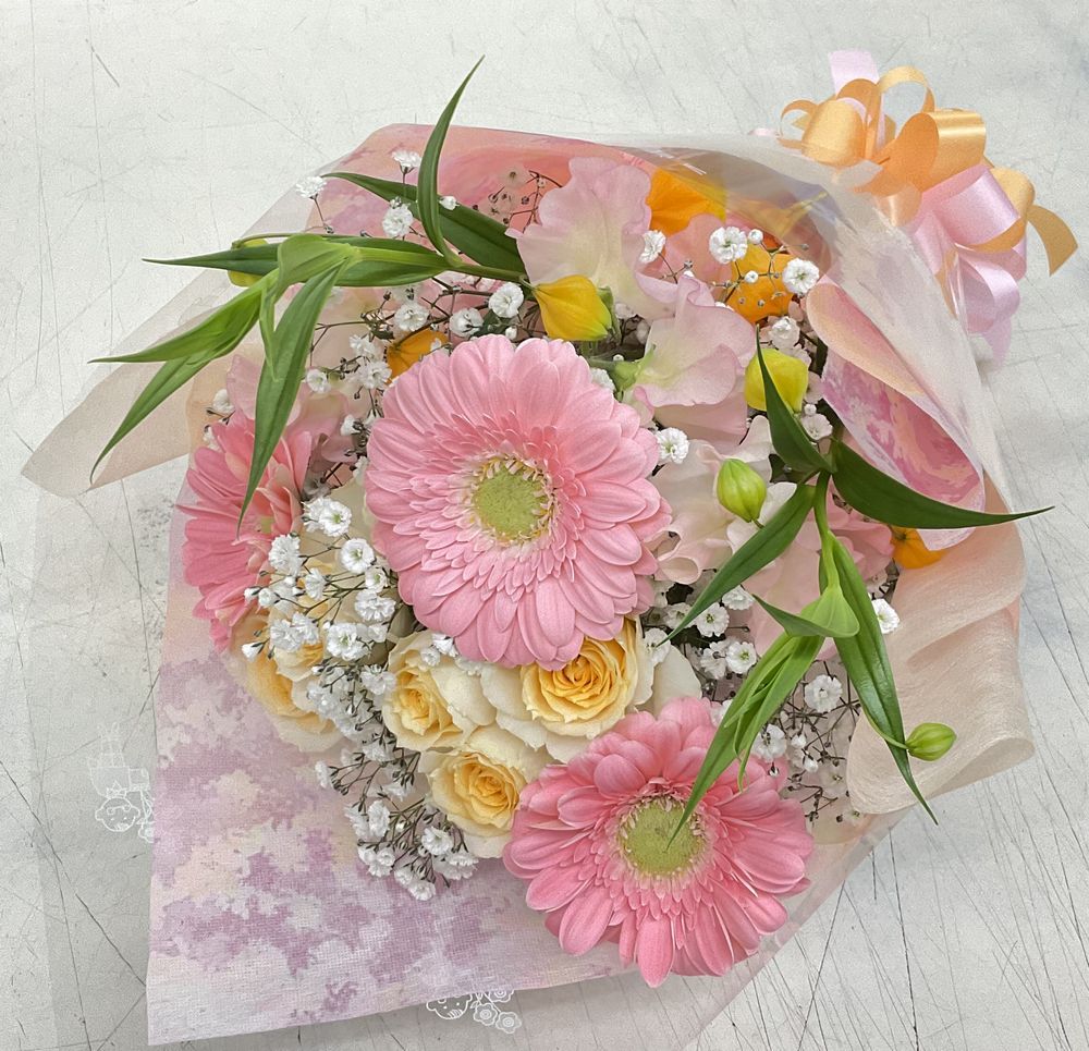 ガーベラ、愛媛県産spバラ「サラ」、塩見さんのスイートピー、サンダーソニア、かすみ草♪