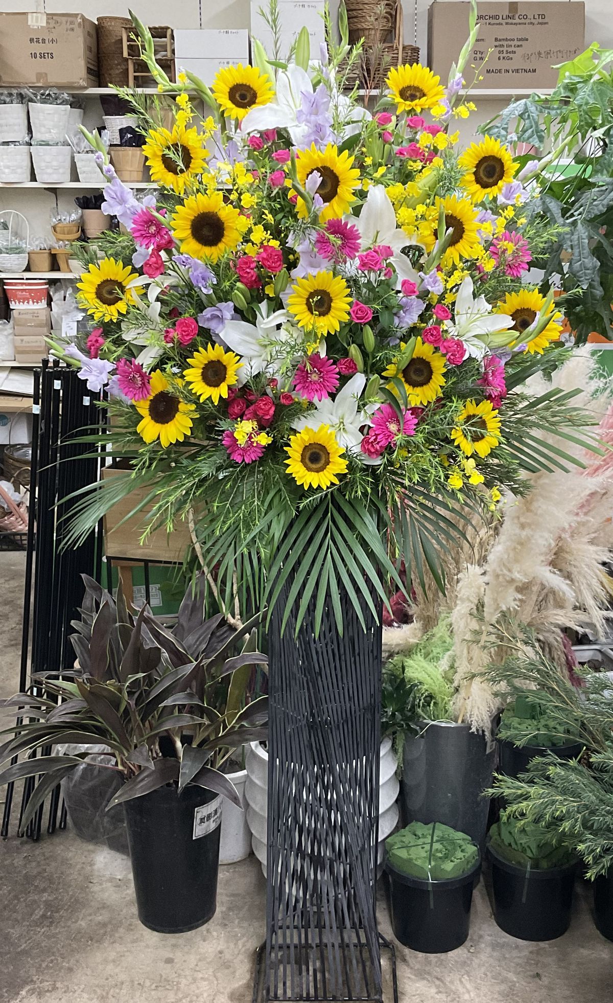 ヒマワリ、オリエンタル系ユリ、グラジオラス、愛媛県産spバラ「アリシア」、ガーベラ、オンシジウム、ティーツリー、アレカヤシほか