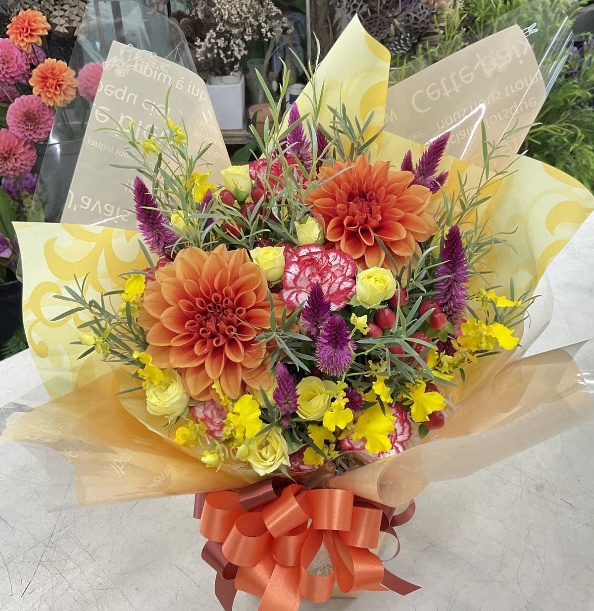 ダリア、ヒペリカム、セロシア、愛媛県産spバラ、spカーネーション、オンシジウムほか
