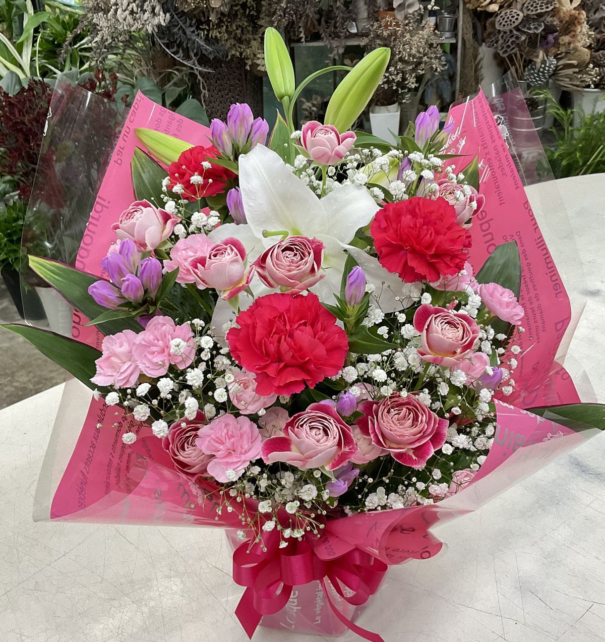 オリエンタル系ユリ、カーネーション、愛媛県産spバラ「チアフル」、リンドウ、spカーネーション、かすみ草ほか